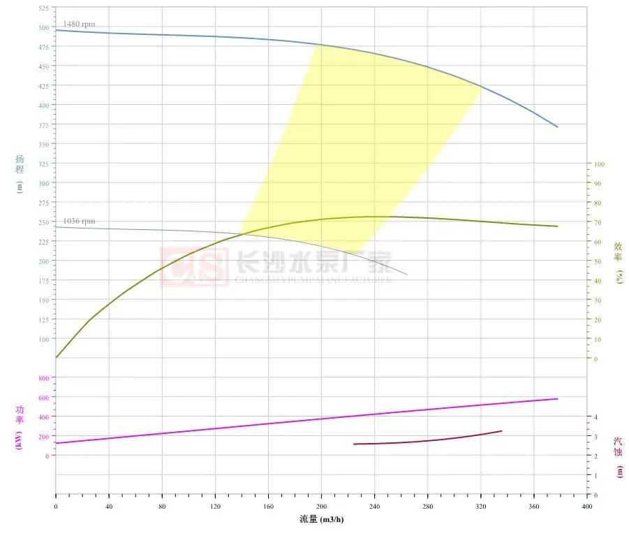 圖中有三條基本曲線(不包括蝕余量(NPSH)):H和Q曲線。從曲線中可以清楚地看出,揚程H下降,其流量Q增加,另一個是功率曲線P。它通常隨著流量Q的增加而增加,但不明顯。重要曲線是效率曲線,隨著流量的增加而增加,但在達到峰值后,它迅速下降(上圖中揚程為50m時最高)。因此,水泵的實際運行應(yīng)盡可能在高效范圍內(nèi)工作。